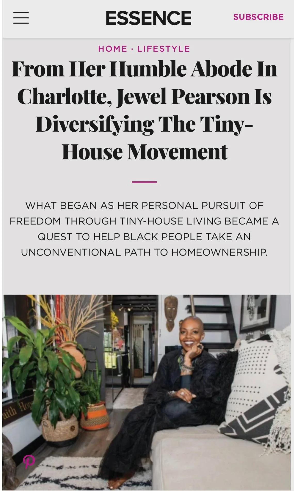 Though aptly described as tiny, Jewel Pearson's home is nothing short of grand. Resplendent in shades of black, white and red, the residence, located 45 minutes outside of Charlotte, North Carolina, includes panoramic windows that open to views of nature; a cozy office that doubles as a lounge: a galley kitchen: a full-size bathroom; and Afro-bohemian artwork throughout. Pearson has managed to create a dream home: an oasis designed to provide ease and restoration.